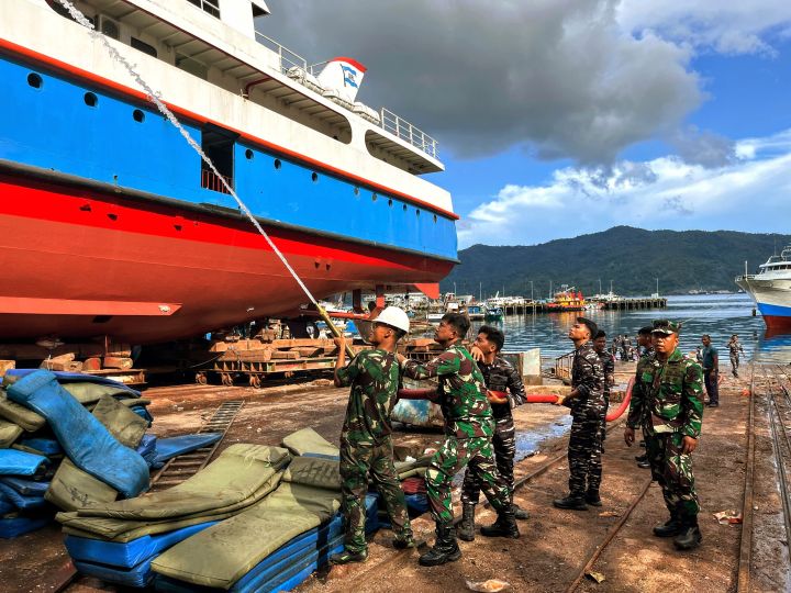 — Prajurit TNI AL kembali tunjukkan aksi sigapnya membantu masyarakat. Kali ini, Prajurit Pangkalan Utama TNI AL (Lantamal) VIII Manado melalui tim tanggap darurat Fasilitas Pemeliharaan dan Perbaikan (Fasharkan) Lantamal VIII Manado berhasil memadamkan kebakaran yang melanda KM UKI RAYA 23 saat kapal tersebut sedang menjalani proses docking di Galangan PT Pathemaang Dock Bitung. Kamis (1/5).