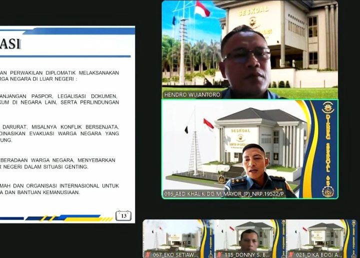 Perwira Siswa Pendidikan Reguler Sekolah Staf dan Komando Angkatan Laut (Pasis Dikreg Seskoal) angkatan ke-65 TA 2026 melaksanakan kegiatan proses belajar mengajar (PBM) online mata pelajaran Perlindungan Warga Negara Indonesia (WNI) di luar negeri, yang diberikan oleh Dosen SBS Sistem Pembinaan Latihan (Sisbinlat) Letkol Marinir Hendro Wijiantoro, S.H., M.Tr.Opsla., Rabu (25/03/2026).