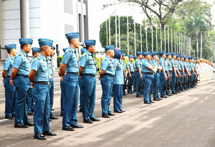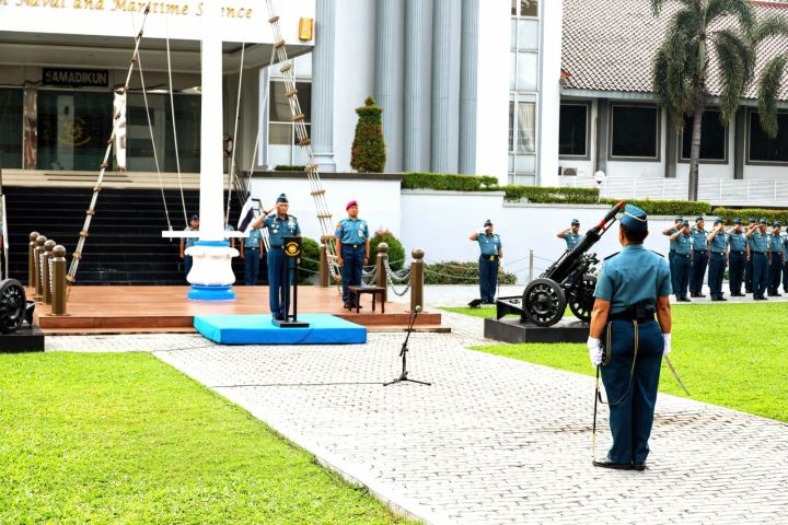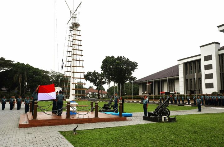 Sekolah Staf dan Komando Angkatan Laut (Seskoal) menggelar upacara penaikan bendera Merah Putih yang diikuti oleh seluruh Prajurit dan Pegawai Negeri Sipil (PNS) di lingkugan Seskoal dengan membacakan amanat Komandan SeskoaL, berlangsung di lapangan apel Laut Jawa Seskoal, Cipulir, Jakarta Selatan, Senin (23/6/2025).
